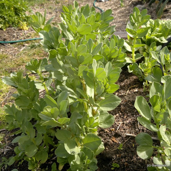 In windy areas it is best to provide some support with posts and string, otherwise the plants will fall across each other. Pick the tops out once beans start setting to prevent blackfly.